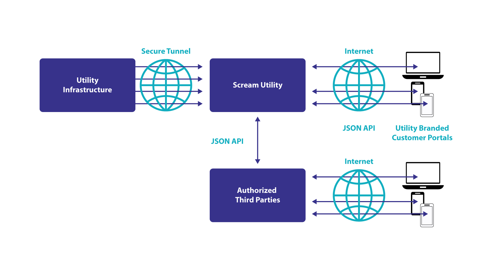 Scream Utility can link to upstream and downstream third-party tools and has an extensive API framework to allow the flow of data to be managed for today’s environment. It is not a replacement of core Utility technology, but it is a “blanket” that stretches over the utility and energy market to remove roadblocks to existing innovation and business needs. Scream Utility can extend the life of legacy systems, so that today’s data engagement can happen more quickly and cost effectively.